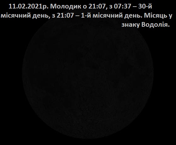 Сьогодні 11 лютого - Молодик о 21:07, з 07:37 – 30-й місячний день, з 21:07 – 1-й місячний день. Місяць у знаку Водолія.