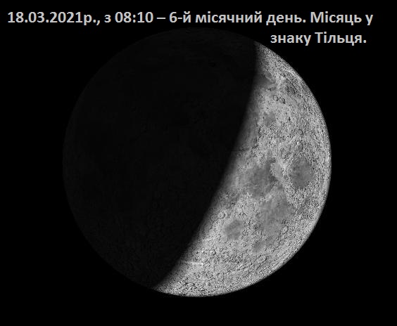 Сьогодні 18 березня - фаза Місяця: I чверть (молодий Місяць), з 08:10 – 6-й місячний день. Місяць у знаку Тільця.