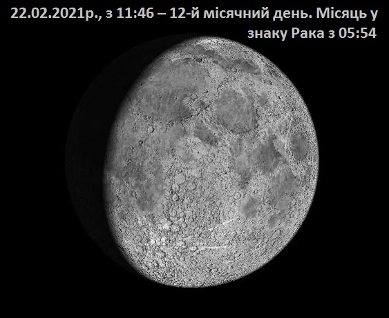 Сьогодні 22 лютого – II чверть (зростаючий Місяць), з 11:46 – 12-й місячний день. Місяць у знаку Рака з 05:54.