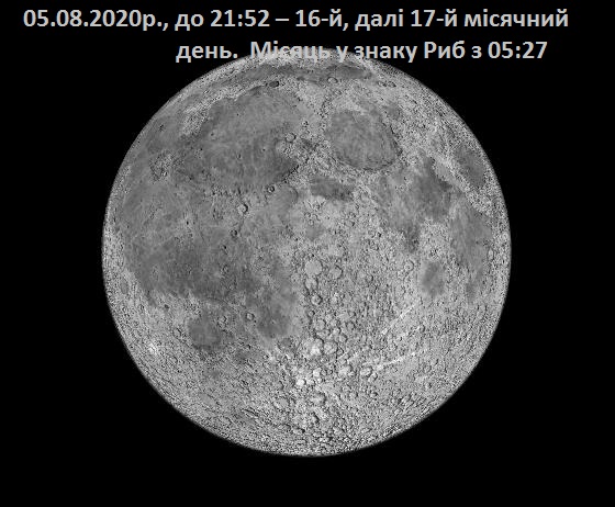 Сьогодні 5 серпня - фаза Місяця: III чверть (спадаючий Місяць), до 21:52 – 16-й, далі 17-й місячний день. Місяць у знаку Риб з 05:27