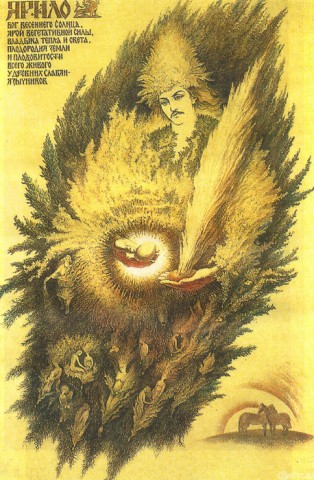 ЯРИЛО – Бог Весняного  Сонця, розквiту природи, родючостi, пристрастi. Корiнь слова Яр- означає ярий, нестримний, збуджений. У давнi часи чоловiча пристрасть порiвнювалась з мужнiстю, войовничiстю й силою. Тому Божества родючостi часто зображалися з мечем. У  балтiйських слов’ян Ярилу вiдповiдає Яровит  (дослiвно ярий витязь, войовничий дух), храм якого iснував у Волегастi до XII ст. Тут на стiнi висiв священний щит мистецької роботи, покритий позолотою, який виносили тiльки в час вiйни, чи найбiльших урочистостей. Це була священна релiквiя. Герборт писав, що Яровит “по латинi називаємий Марсом”.