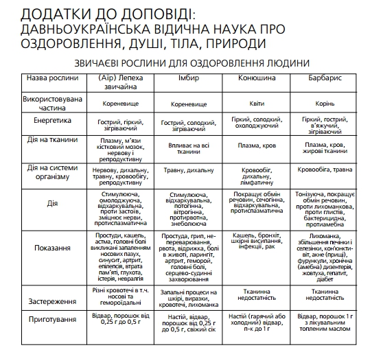 7. При описаннi трав вказується: яка частина використовується, енергетика (смак), дiя на тканини (плазму, м‘язи, iншi); дiя на системи органiзму (нервову, дихальну, травну iнш.); дiя – стимулююча, омолоджуюча, протиспазматична, показання до застосування, застереження i форми приготування. (Див. додаток.)